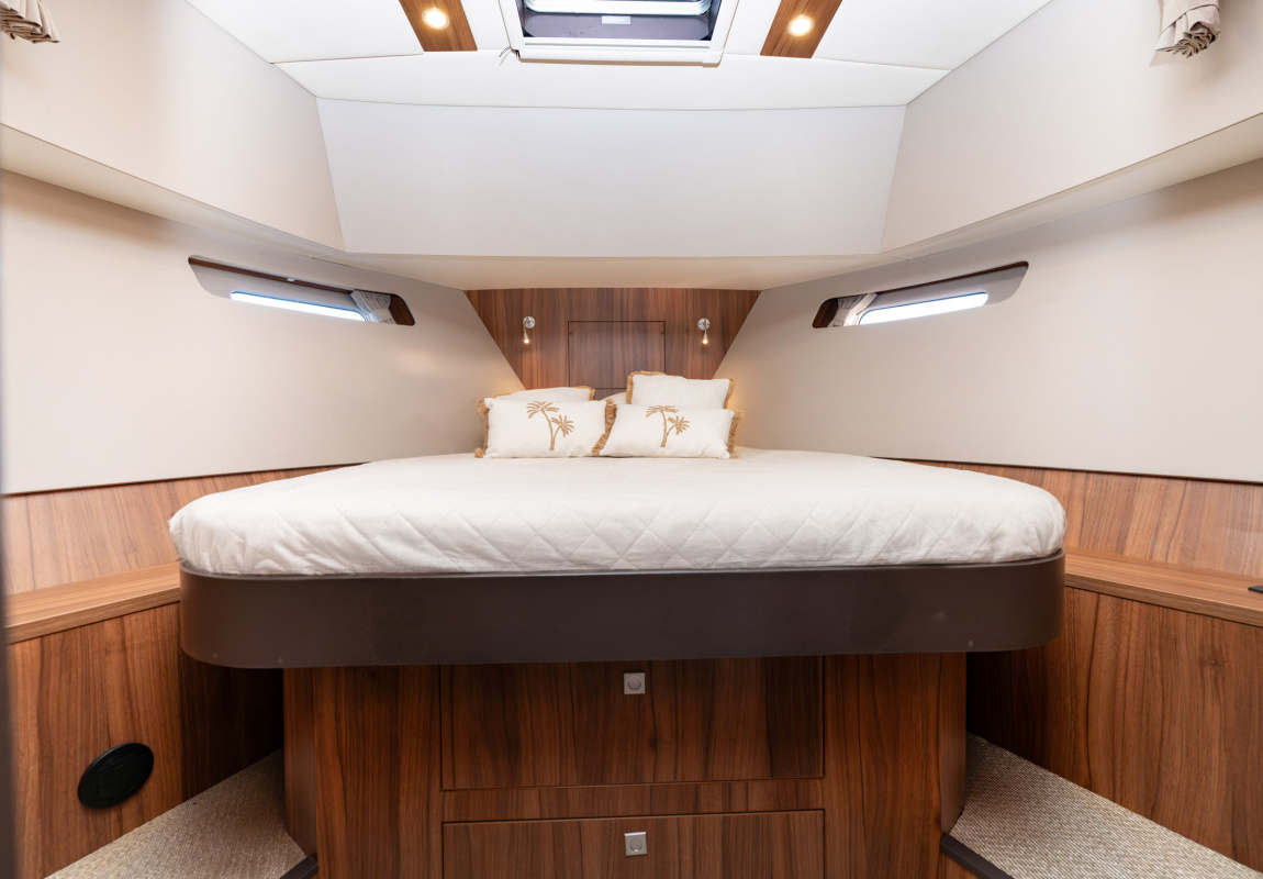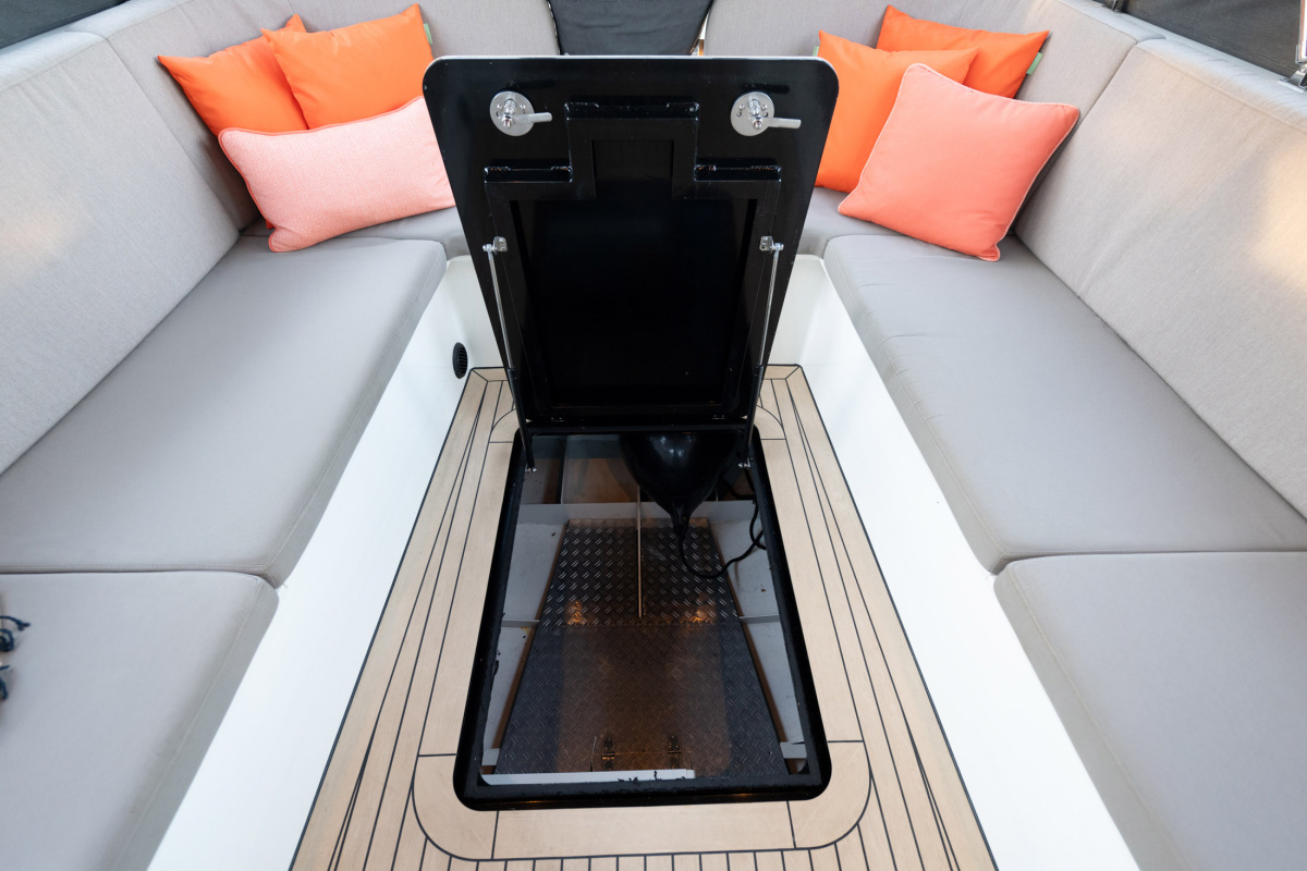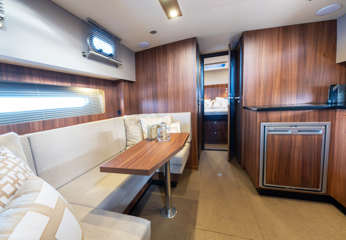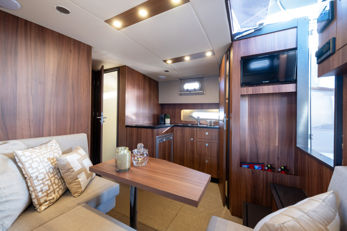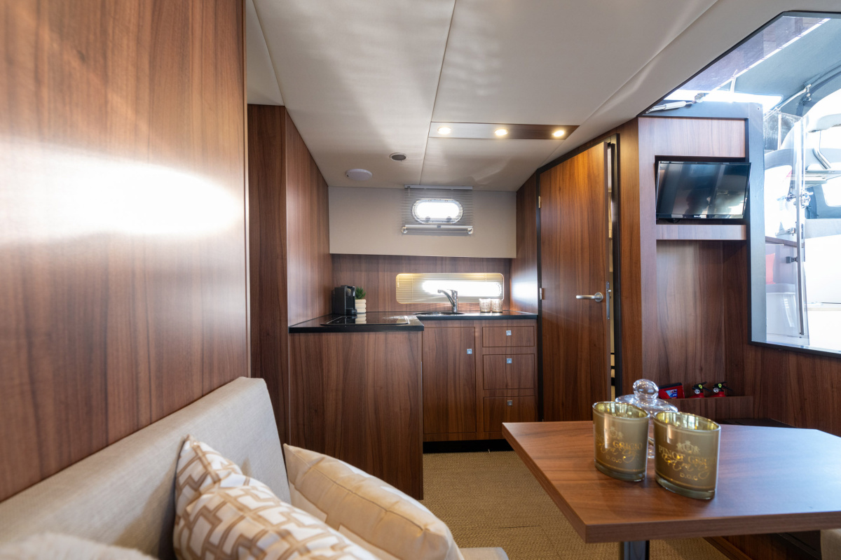 De royale kuip van deze Jetten 38 Cabrio is voorzien van comfortabele zitbanken en twee luxe stuurstoelen. Perfect voor ontspannen vaartochten! Binnen treft u een luxe en modern noteninterieur, met een ruim L-vormig kombuis en een gezellige U-vormige zit.
