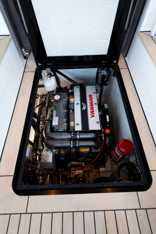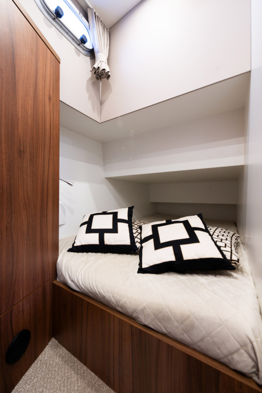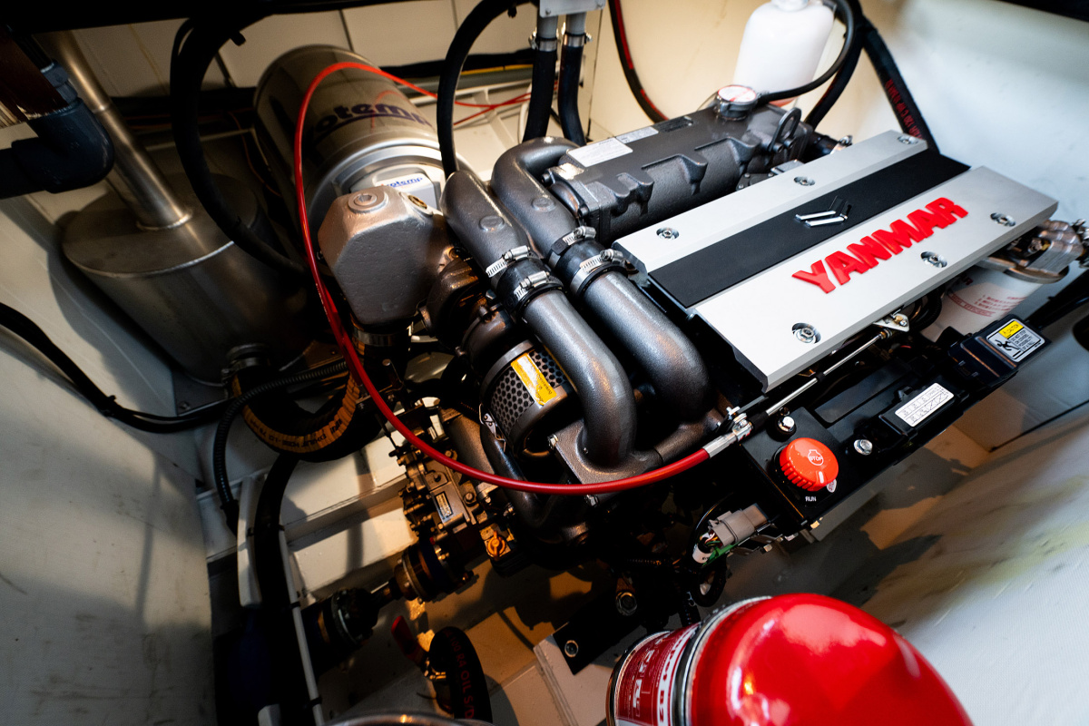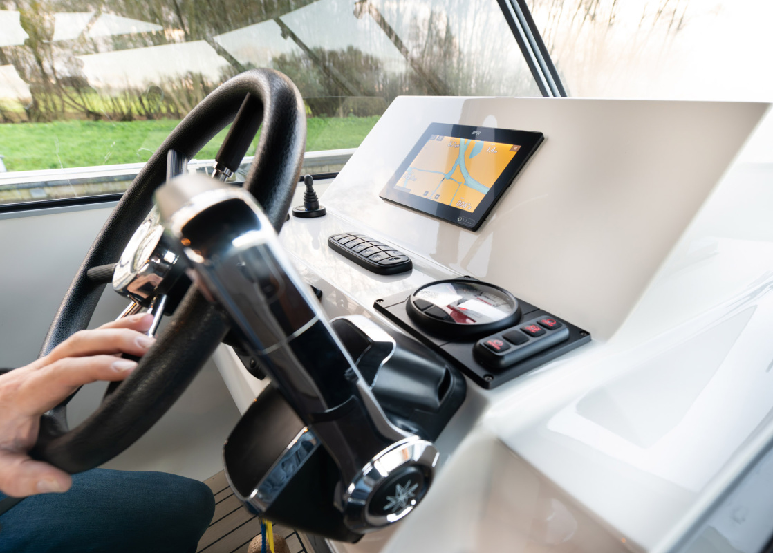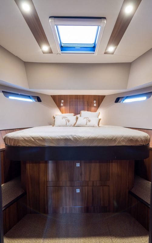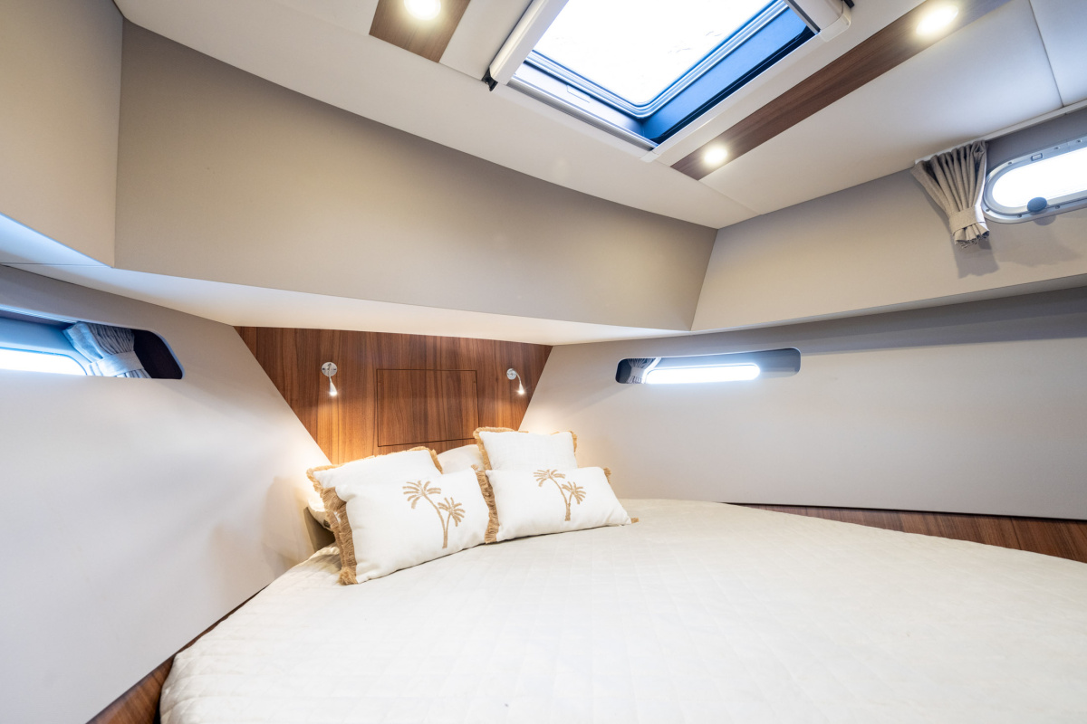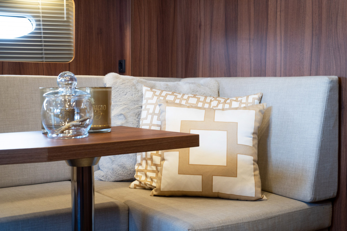 De royale kuip van deze Jetten 38 Cabrio is voorzien van comfortabele zitbanken en twee luxe stuurstoelen. Perfect voor ontspannen vaartochten! Binnen treft u een luxe en modern noteninterieur, met een ruim L-vormig kombuis en een gezellige U-vormige zit.
