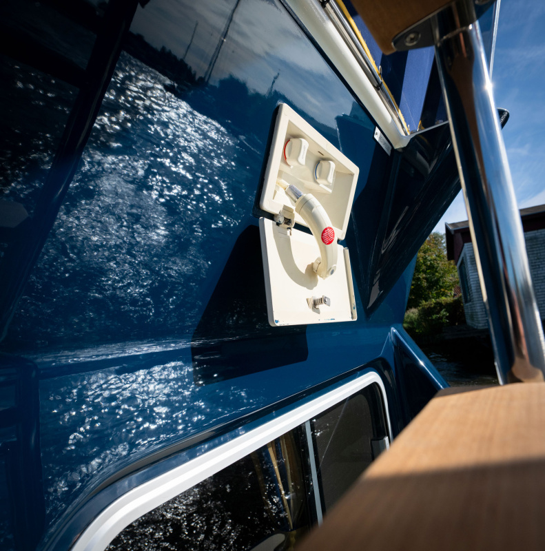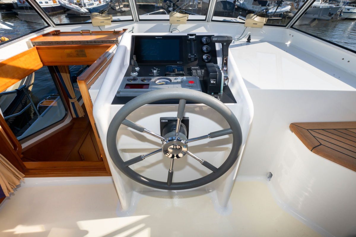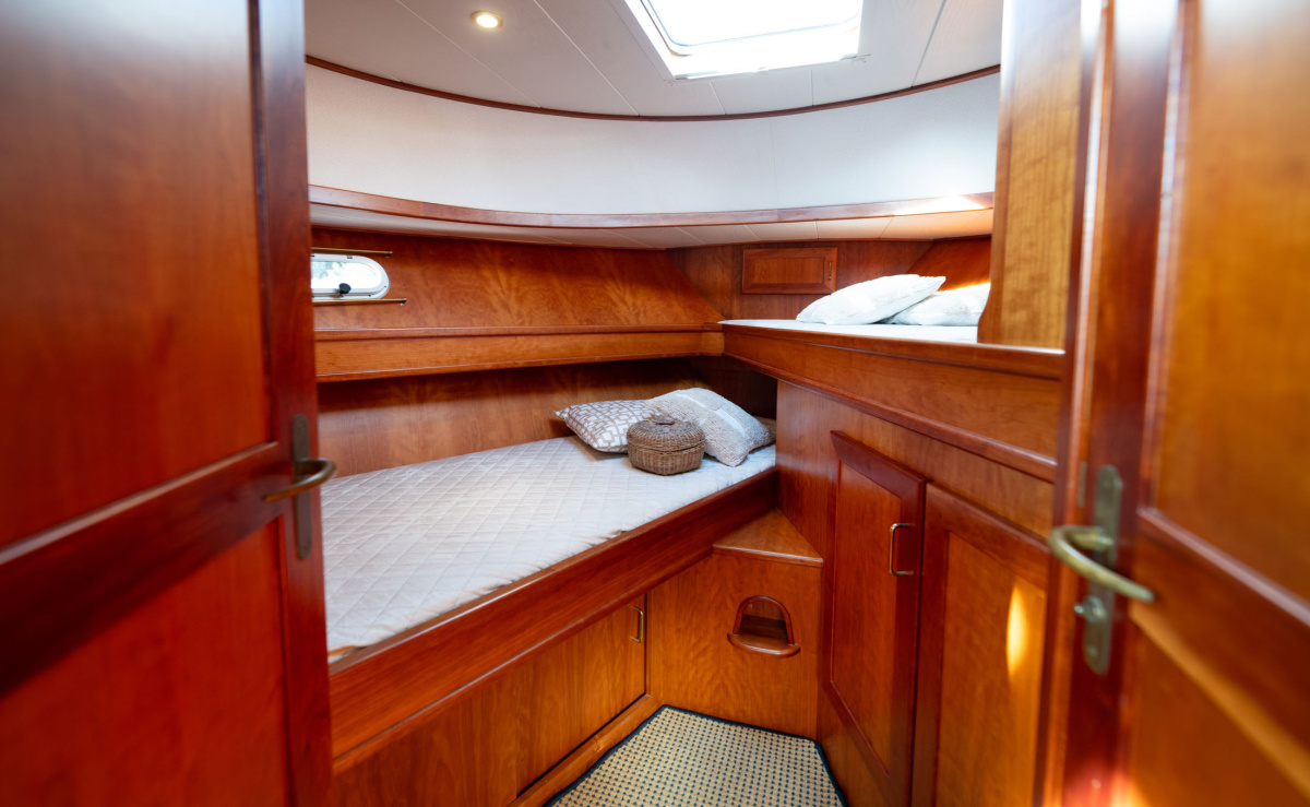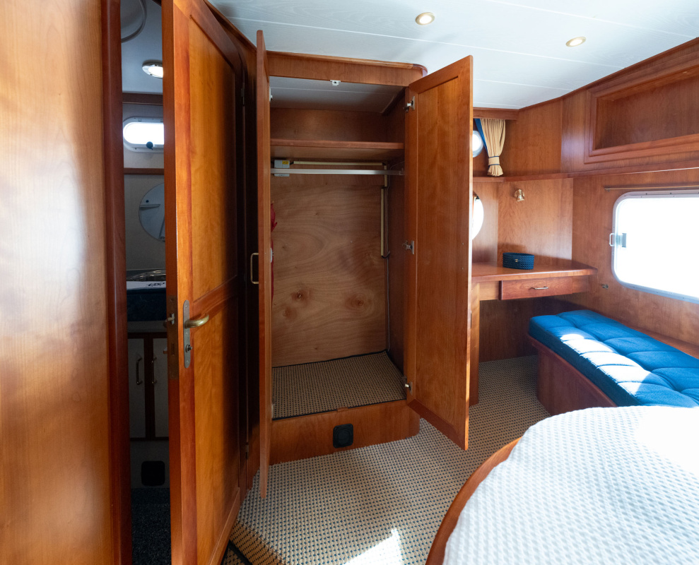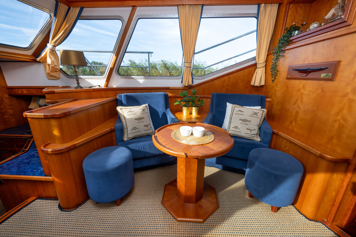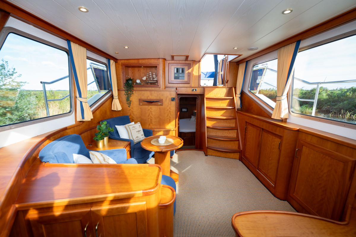 Binnen wordt u verwelkomd door een warm en stijlvol Italiaans kersenhouten interieur, waar vakmanschap en sfeer samenkomen. Een perfecte combinatie van comfort en klasse, ideaal voor ontspannen tochten én lange reizen.